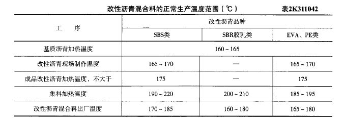 见表格2K311042,改性沥青混合料的正常生产范围,工序改性沥青混合料出厂温度为170~185℃