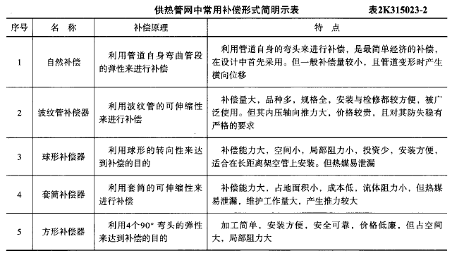 供热管网中常用的补偿器形式。参见考试用书表2K315023-2,可知:自然补偿器的特点为:利用管道自身的弯头来进行补偿,是最简单经济的补偿,在设计中首先采用。但一般补偿量较小