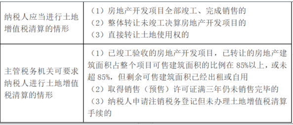 纳税人应进行土地增值税清算的情况:(1)房地产开发项目全部竣工、完成销售的;(2)整体转让未竣工决算房地产开发项目的;(3)直接转让土地使用权的。