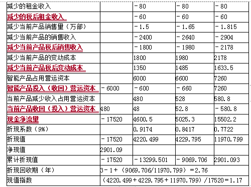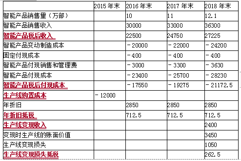 公司现有一闲置厂房对外出租,每年年末收取租金80万元,该厂房可用于生产该智能产品,因生产线安装期较短,安装期间租金不受影响。由于智能产品对当前产品的替代效应,当前产品2016年销量下降1.5万部,下降的销量以后按每年10%增长,2018年末智能产品停产,替代效应消失。