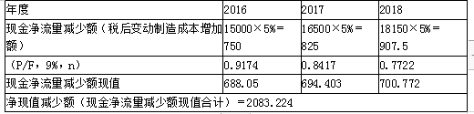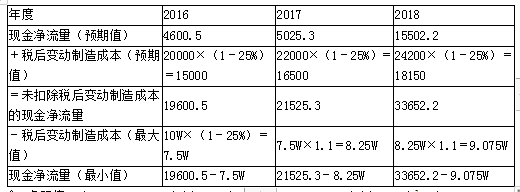 假设单位变动制造成本的最大值为W元,则2016年~2018年各年的现金净流量估算如下(单位:万元):