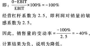 假设经营杠杆系数为2.5,在由盈利(息税前利润)转为亏损时,销售量下降的最小幅度为( )。