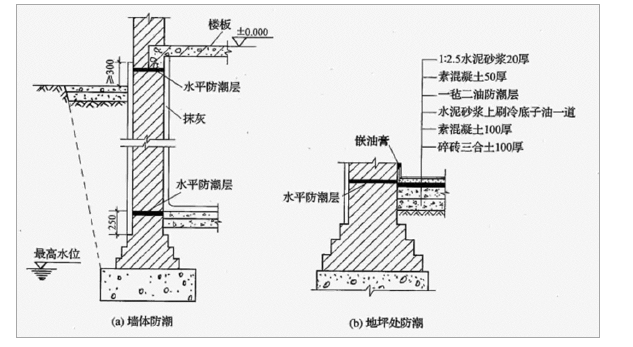 对于砖墙,其构造要求是:墙体必须采用水泥砂浆砌筑,灰缝要饱满;在墙外侧设垂直防潮层。其具体做法是:在墙体外表面先抹一层20mm厚的水泥砂浆找平层,再涂一道冷底子油和两道热沥青,然后在防潮层外侧回填低渗透土壤,并逐层夯实,土层宽500mm左右,以防地面雨水或其他地表水的影响。