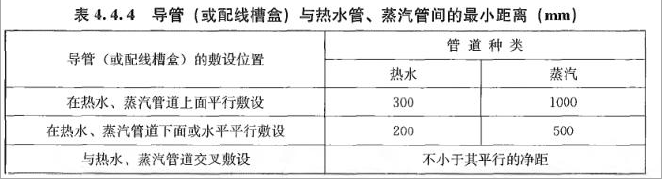 (6)导管与热水管、蒸汽管平行敷设时,宜敷设在热水管、蒸汽管的下面,当有困难时,可敷设在其上面;相互间的最小距离宜符合表4.4.4 规定。