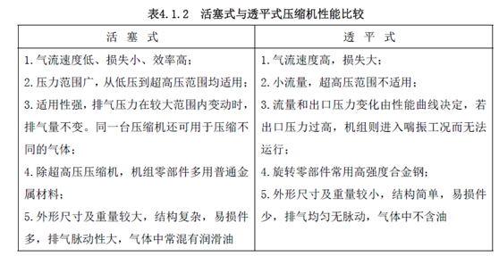活塞式与透平式压缩机的性能比较见表4.1.2。