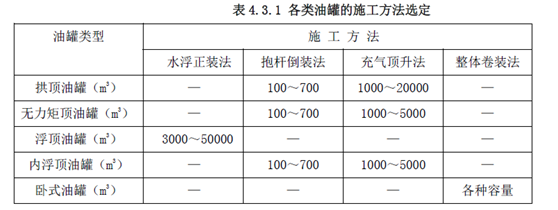根据金属油罐的不同结构,可选用机械正装法、抱杆倒装法、卷装法、充气顶升法和水浮正装法(参见表5.4.1)。