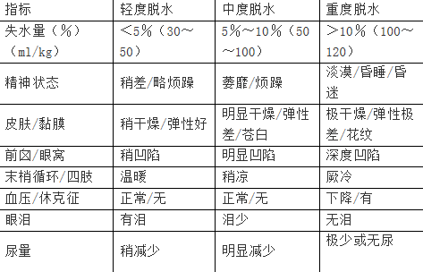 男,4个月,体重5kg。腹泻3天,每日7~8次,蛋花汤样、无腥臭,奶后呕吐2次。面色稍苍白,上腭裂,精神较差,皮肤稍干燥。眼窝、前囟凹陷。皮下脂肪减少,皮肤弹性较差。哭有泪。四肢末梢较冷,血清钠128mmol/L。