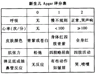 Apgar评分是一种简易的临床评价刚出生婴儿窒息程度的方法。通过对呼吸、心率、皮肤颜色、肌张力、对刺激的反应等五项指标评分,以区别新生婴儿窒息程度。五项指标每项2分,共10分,8~10分为正常,4~7分为轻度窒息0~3分为重度窒息(见下表)。