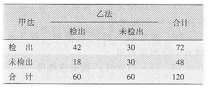 甲、乙两种方法检查已确诊为肝癌患者120例,现用两种方法进行检查有如下结果
