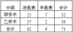 某医师比较两种不同手术治疗某病的疗效,共收治患者71例,结果如下表