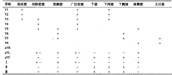 ST抬高性心肌梗死:①起病数小时内,可尚无异常或出现异常高大两肢不对称的T波。②数小时后,ST段明显抬高,弓背向上,与直立的T波连接,形成单相曲线。数小时至2日内出现病理性Q波,同时R波减低,是为急性期改变。Q波在3~4天内稳定不变,以后70%~80%永久存在。③在早期如不进行治疗干预,ST段抬高持续数日至两周左右,逐渐回到基线水平,T波则变为平坦或倒置,是为亚急性期改变。④数周至数月后,T波呈V形倒置,两肢对称,波谷尖锐,是为慢性期改变。T波倒置可永久存在,也可在数月至数年内逐渐恢复。非ST抬高心肌梗死:上述的类型1.先是ST段普遍压低(除aVR,有时VI导联外)而T波倒置加深呈对称型,但始终不出现Q波。ST段和T波的改变持续数日或数周后恢复。类型2.T波改变在1~6个月内恢复。